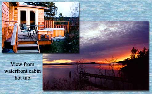 The Waterfront Cabin has a spectacular view to the southwest, capturing the warm winter sun. A fully equipped kitchen allows you to stay at home, relax, and prepare you own food. A private outdoor hot tub for two overlooking Buck Bay is a new addition for relaxation. A picture window allows a morning view of the water from the queen size bed